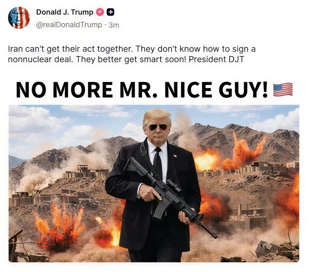 Postimi u shoqërua me një imazh të krijuar me inteligjencë artificiale, ku Trump shfaqet me një mitraloz mes shpërthimeve. Mesazhi i bashkëngjitur ishte i drejtpërdrejtë: “Jo më z. djali i mirë”.